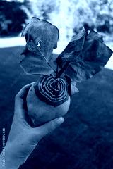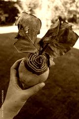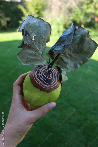 Close-up of woman’s hand holding rotten Quince apple with disease. Monilinia laxa or Monilinia fructigena infestation