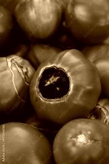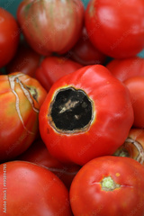 Red round tomato with late blight disease in a plastic bowl with other tomatoes. Phytophthora infestans