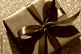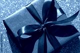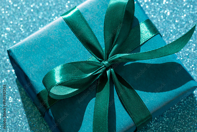 Blue Christmas gift box with green ribbon bow on the glitter background. Close up