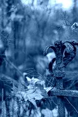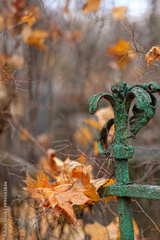 aged vintage wrought-iron fence with dry fallen leaves in autumn park. Lost abandoned place. fall season. melancholy aesthetic atmosphere