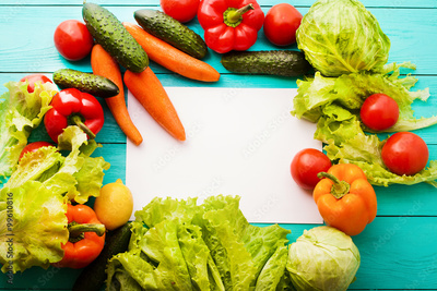 Different vegetables on kitchen table with recipe list and copy space. Top view