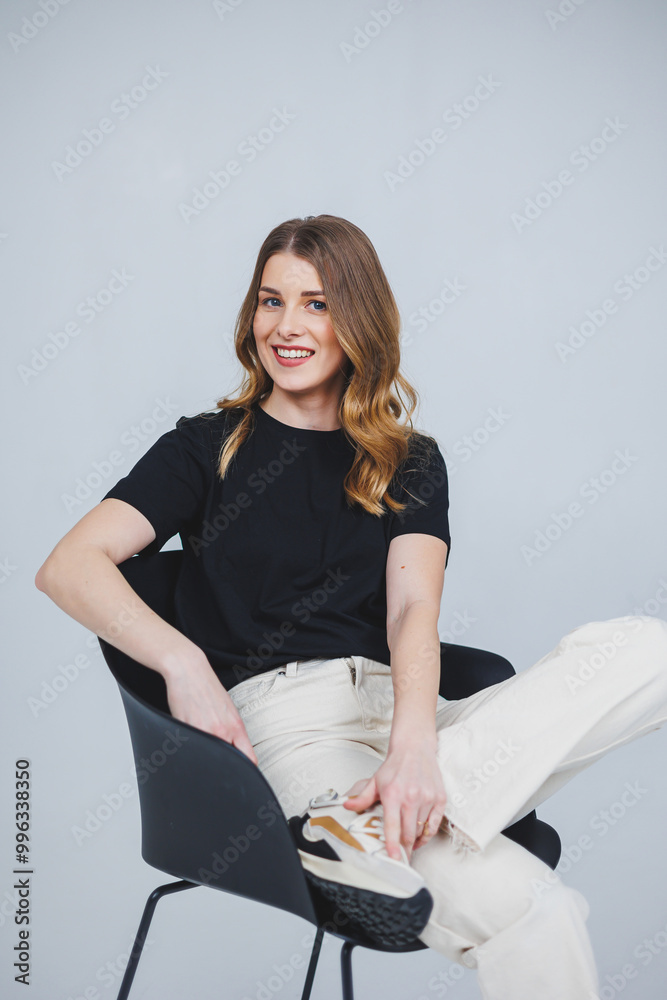A pretty woman in a black t-shirt and white pants on a white background. Smiling woman in casual clothes on a white background.