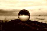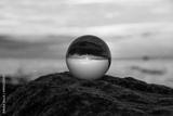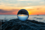 Ball made of glass lies on a stone in which the beach and the sea are reflected