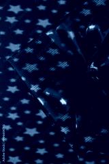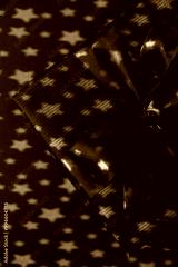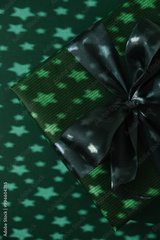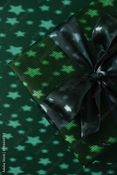 Green Christmas gift box with star pattern light shadows. Close up