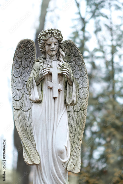 beautiful stone statue of Angel with cross on old cemetery, autumn nature background. Design for condolence, mourning cards or obituary. religion, faith in God, mourn, memory concept. all saints day