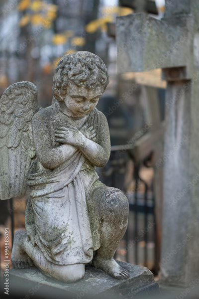 angel baby statue on old cemetery, autumn nature background. Design for condolences, mourning card or obituary. symbol of religion, faith, Remember, mourn, memory. all saints day, All Souls Day