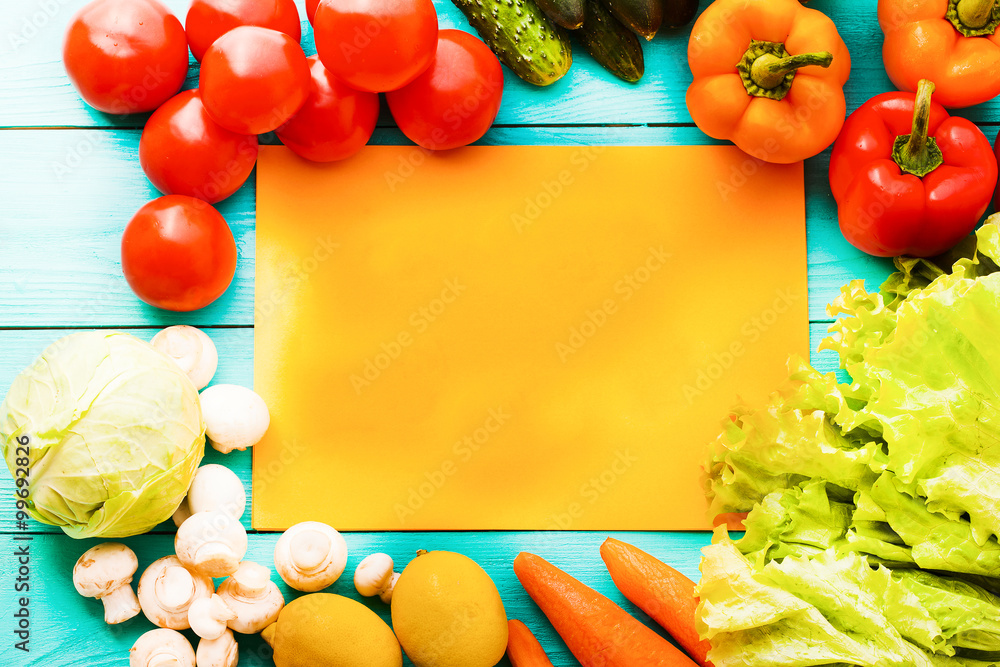 Frame of vegetables with white copy space on blue wooden table. Top view