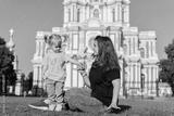 A little child girl and her young mother sit on the grass in front of Smolny Cathedral in St. Petersburg on a sunny summer day. The concept of active childhood and tourism.
