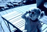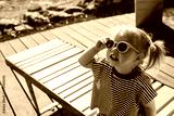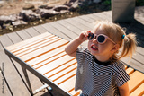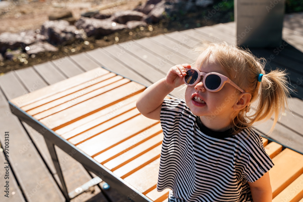 Portrait of Little child Caucasian in sunglasses on bench outside in summer.