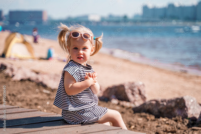 An adorable little toddler is walking along beach, a beautiful landscape and a cute childhood concept.