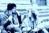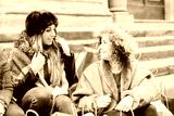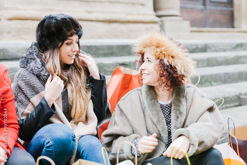 Two girlfriends woman after shopping, they take a break and talking on a staircase in the city. Around them bags with merchandise bought