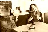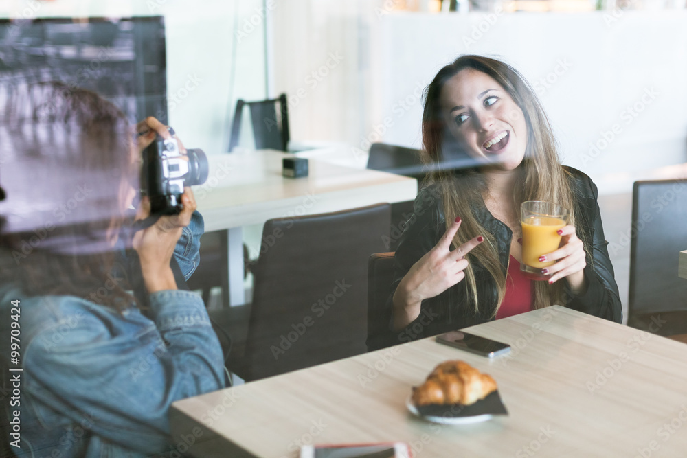 Two young women at a table in a bar. A girl takes a picture with a camera to her friend. The other looks at her smiling with a glass in his hand and opening the mouth