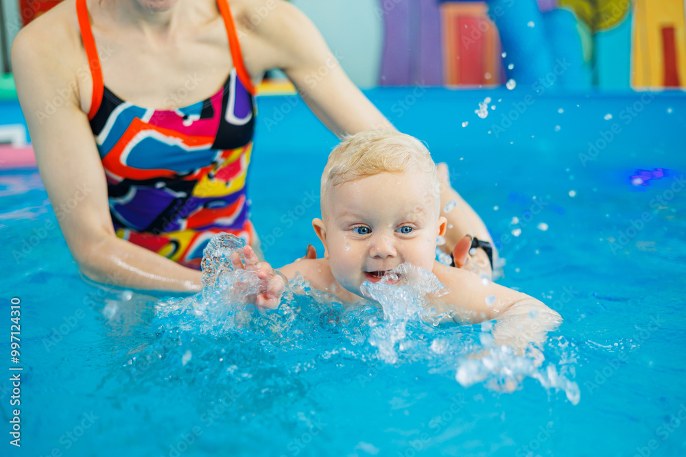 A baby boy in the pool learns to swim with a coach. Swimming pool for teaching children to swim