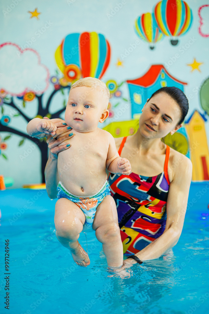 A baby boy in the pool learns to swim with a coach. Swimming pool for teaching children to swim