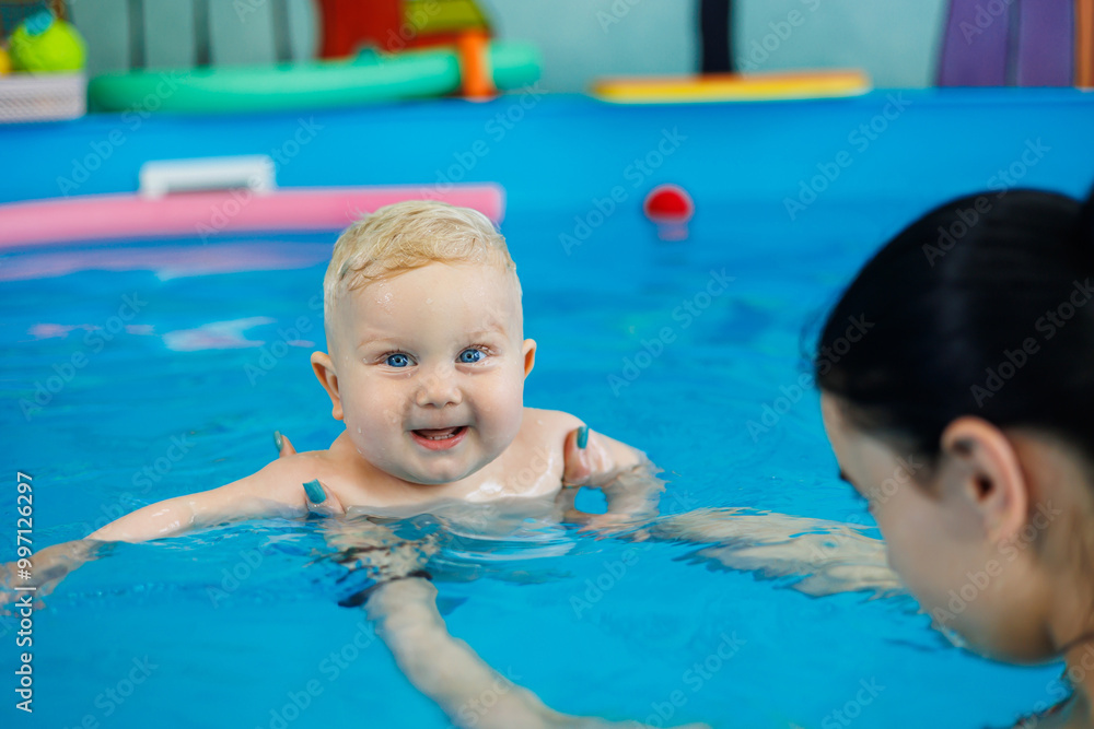 A baby boy in the pool learns to swim with a coach. Swimming pool for teaching children to swim