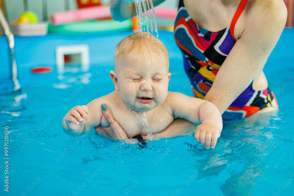 A baby learns to swim with a coach in the pool. Swimming in an early age pool. Happy child with female trainer in indoor swimming pool playing and having fun.