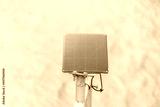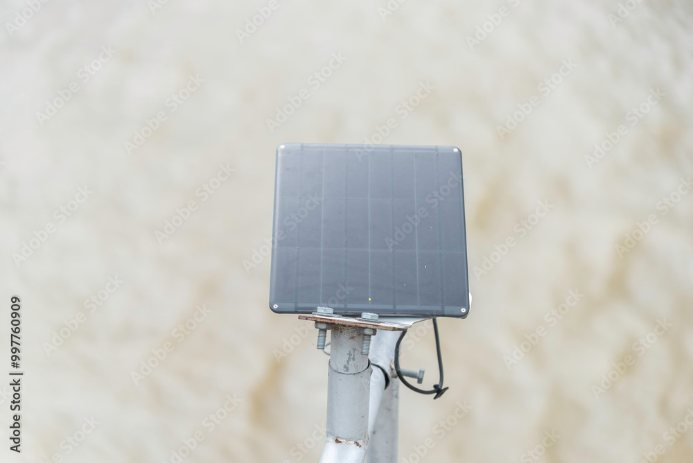 Mini photovoltaic or solar cell panel and floodlight led installed on metal pole against sunset