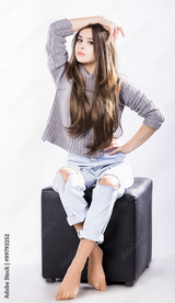 beautiful girl in a knitted sweater sitting on a black wig on a white background. Long dark hair. torn jeans
