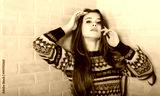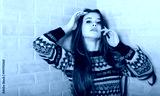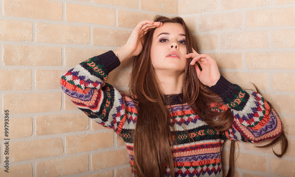 beautiful girl in a multicolored knitted sweater stands near the brick wall. Near the window.