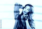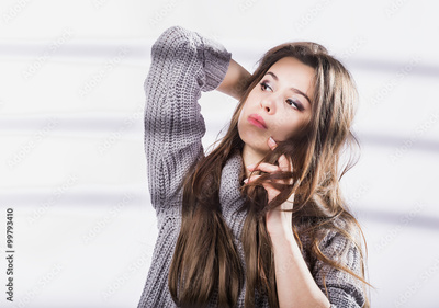 beautiful girl with long dark hair photographed by a black grille, a chair. On a white background.