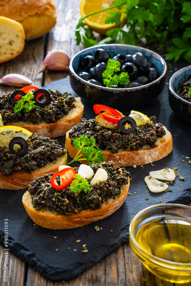 Tasty bruschetta with tapenade served on black stony board on wooden table