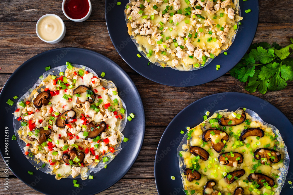 Vietnamese pizza - rice pepper omelet with mushrooms chicken meat and fresh vegetables served on black plate on wooden table