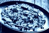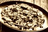 Vietnamese pizza - rice pepper omelet with mushrooms chicken meat and fresh vegetables served on black plate on wooden table