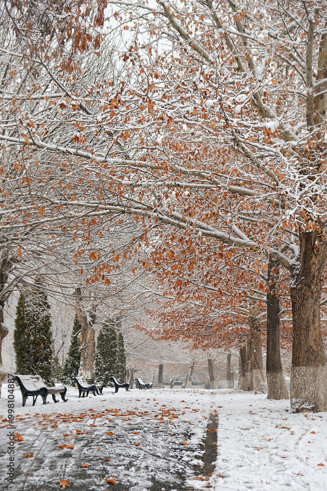 autumn park with first snow and fallen leaves. beautiful landscape of late autumn or early winter season. cold frozen weather
