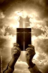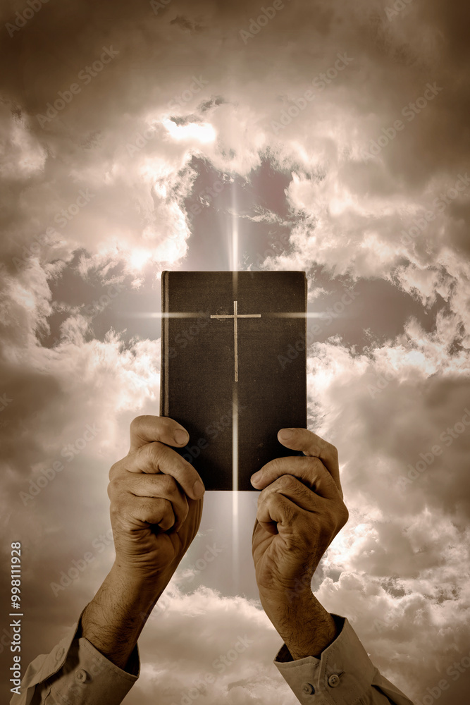 Hands holding Holy Bible against the sky. Cross on a dark cover book. Sacred scripture.