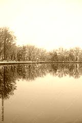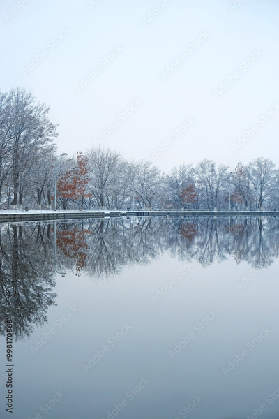 Beautiful landscape of lake and autumnal trees in park. reflection in water. autumn park in late autumn or early winter season. cold frozen weather atmosphere nature. harmony peaceful image