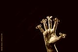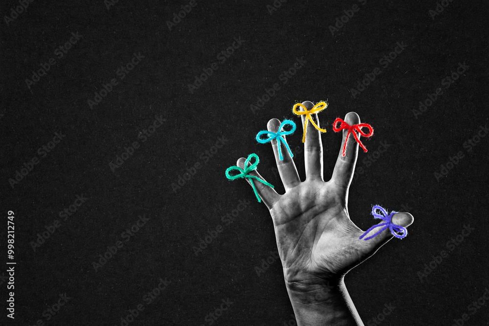 Five Colorful Rope Bows on Fingers Reminder Sign in Black and White on Textured Paper Background, Copy Space