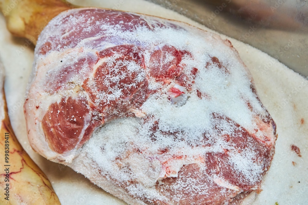 Raw meat in salt for cooking pork ham. Meat production.