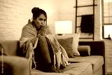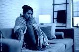 Young woman trying to warm herself while sitting wrapped in a blanket at home with no heating.
