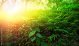 Warm yellow sunlight shines through leaves and tree branches inside in tropical forest. Beautiful green nature background