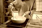 Cropped shot young woman cooking scrambled eggs in a green frying pan on kitchen counter