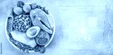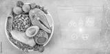 Organic healthy food in wooden bowl, Proper nutrition, virtual icons innovative technologies
