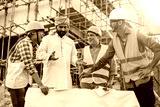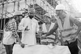 Architect engineer technician construction worker all working together as a team, working communicating on blueprint design planning analyzing innovation on building landscape housing architecture.