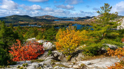 Fall scene in the Quebec cottage country with golden leaves and fall colors.