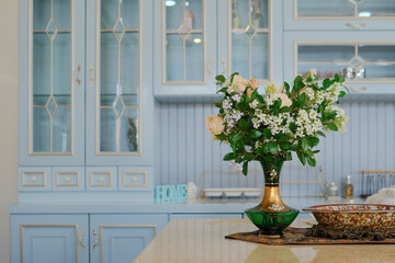 "Elegant kitchen interior with a classic design featuring pastel blue cabinets with gold accents. The countertop is adorned with beautiful floral arrangements, including a bouquet of pink and white fl