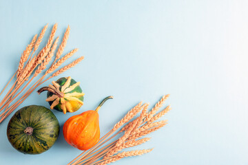 Banner with bright gold glittering stars confetti scattered on a blue pastel background with place for text.