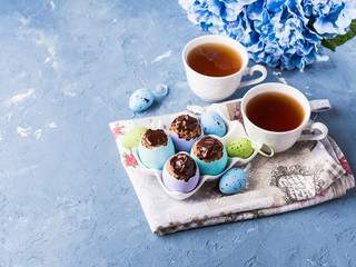 Baking Christmas cookies card. Christmas spices, cookie cutters, ingredients for christmas baking and kitchen utensils gingerbread cookies on blue pastel background