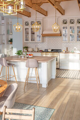 modern expensive luxurious open-plan apartment. Rich Scandinavian-style interior with wooden beams on the ceiling in pastel colors