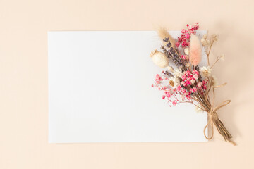 photo of spring white cherry blossom tree on pastel background. View from above, flat lay, copy space. Spring and summer background.