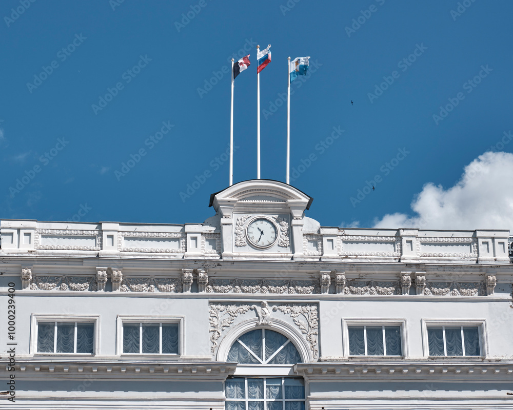 Facade of Sarapul city administration building, Russia. Three flags - Russia, Udmurt, Sarapul