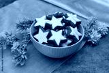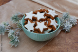 Zimtsterne traditionelle Weihnachtsplätzchen in einer Keramikschale mit Tannenzweigen.