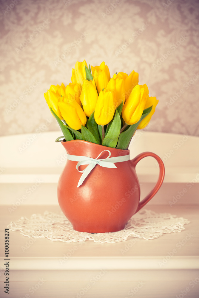 Bunch yellow tulips in jug on wooden table