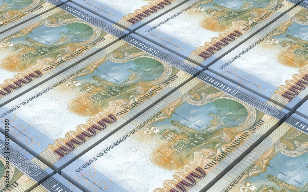 Armenian drams bills stacked background. Computer generated 3D photo rendering.