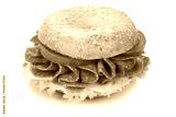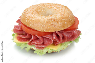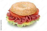 Bagel Brötchen zum Frühstück belegt mit Salami Schinken Freis