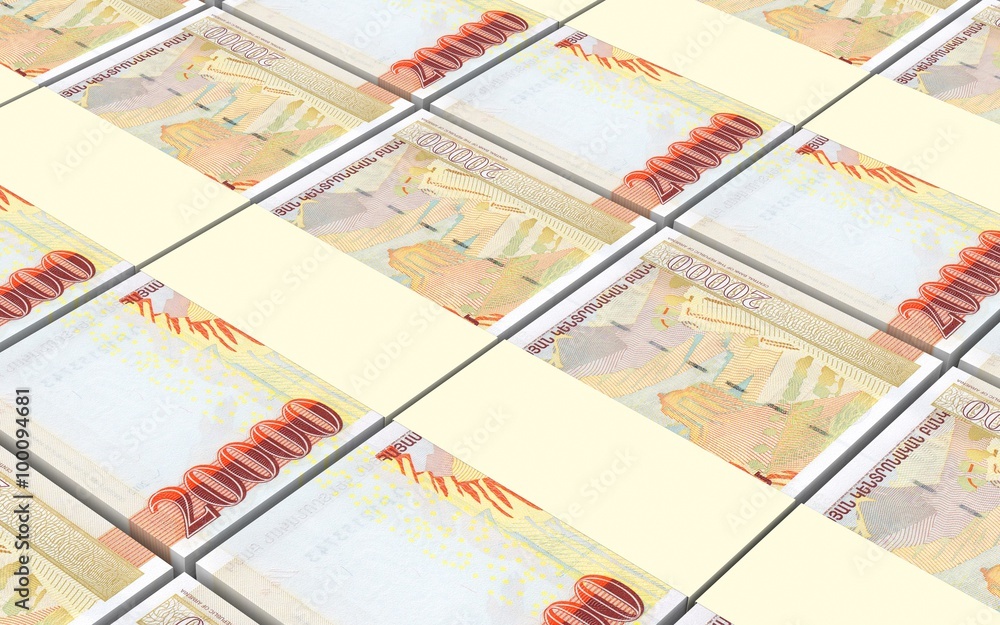 Armenian drams bills stacked background. Computer generated 3D photo rendering.
