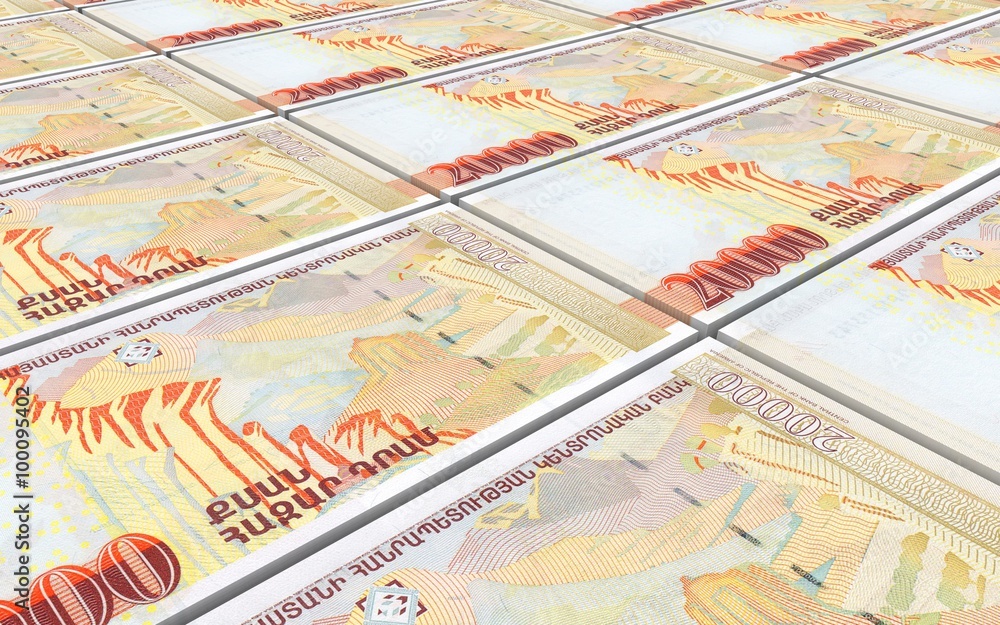 Armenian drams bills stacked background. Computer generated 3D photo rendering.
